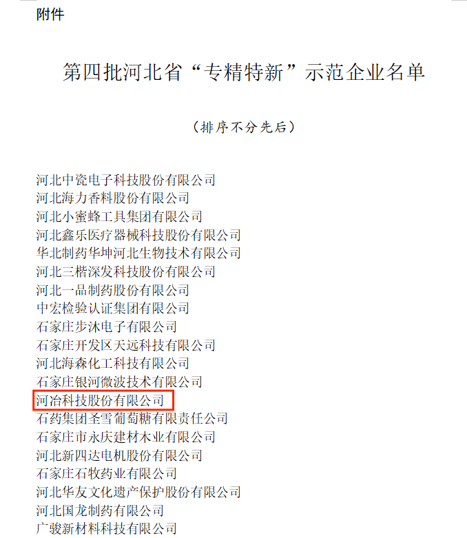 2021年12月30日,河北省工業(yè)和信息化廳發(fā)布了《關于公布第四批河北省“專精特新”示范企業(yè)的通知》(冀工信企業(yè)函〔2021〕1029號)。通過前期申報,河冶科技股份有限公司通過了市級、省級的嚴格審核,被認定為河北省“專精特新”示范企業(yè)。