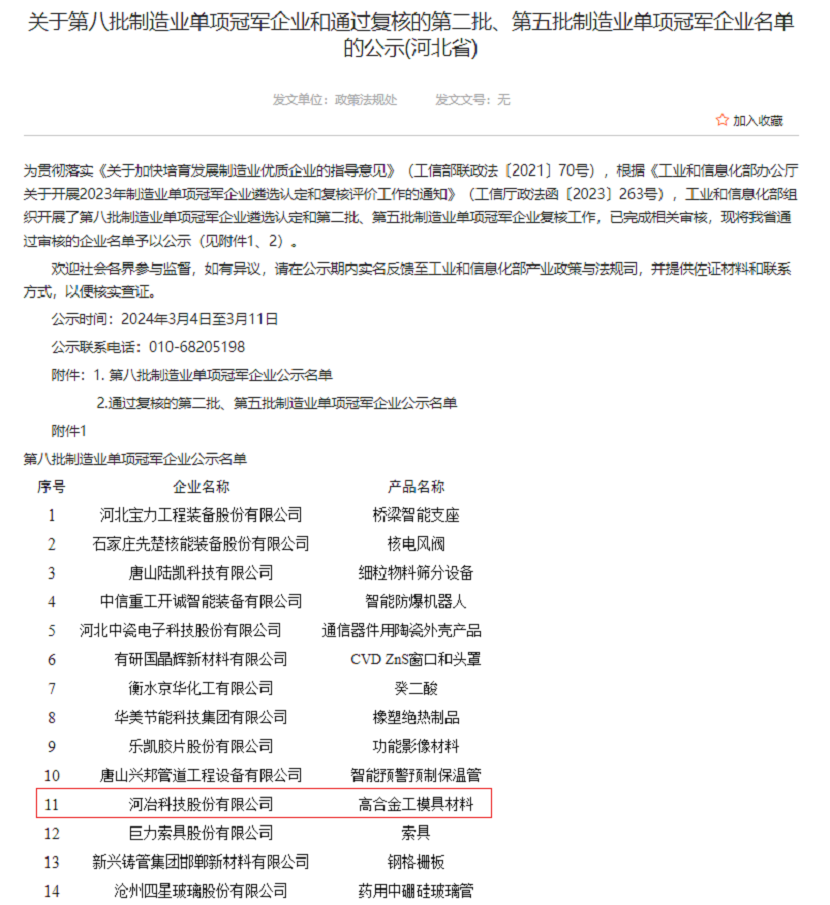 根據(jù)《工業(yè)和信息化部辦公廳關于開展2023年制造業(yè)單項冠軍企業(yè)遴選認定和復核評價工作的通知》(工信廳政法函〔2023〕263號),工業(yè)和信息化部組織開展了第八批制造業(yè)單項冠軍企業(yè)遴選認定和第二批、第五批制造業(yè)單項冠軍企業(yè)復核工作,已完成相關審核,河冶科技股份有限公司被認定為第八批制造業(yè)單項冠軍企業(yè)。