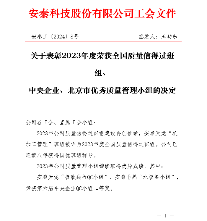 為鼓勵(lì)員工參與質(zhì)量提升及改善活動(dòng),提高質(zhì)量意識(shí)和創(chuàng)新能力,持續(xù)進(jìn)行質(zhì)量改善、降低消耗、提高工作效率,河冶科技-質(zhì)管部超聲探傷QC小組榮獲中央企業(yè)、北京市優(yōu)秀質(zhì)量管理小組三等獎(jiǎng), 2023年安泰科技第十一屆優(yōu)秀質(zhì)量管理小組二等獎(jiǎng)。