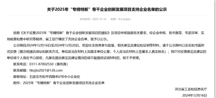 近日,公司憑借在專業(yè)領(lǐng)域內(nèi)的持續(xù)深耕與創(chuàng)新,再度榮獲河北省“專精特新”示范企業(yè)認(rèn)定。這一榮譽(yù)的再次獲得,不僅是對(duì)公司長(zhǎng)期以來(lái)堅(jiān)持專業(yè)化、精細(xì)化、特色化、新穎化發(fā)展道路的肯定,更是對(duì)公司不斷創(chuàng)新、追求卓越精神的認(rèn)可。
